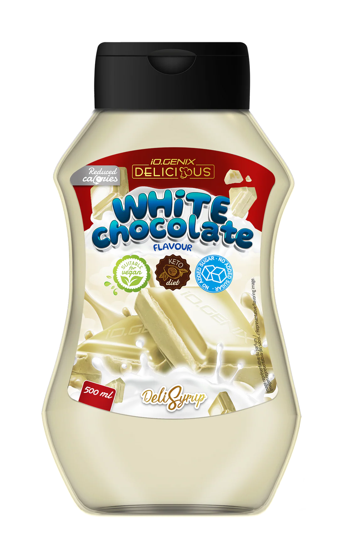 White Chocolate : Eau, poudre d'huile MCT (contient des protéines de lait (lait)), amidon modifié, épaississant (gomme xanthane), arômes, correcteurs d'acidité (acide lactique et glucono-delta-lactone), conservateurs (benzoate de sodium et sorbate de potassium), édulcorant (sucralose), sel et colorant (carotènes).
